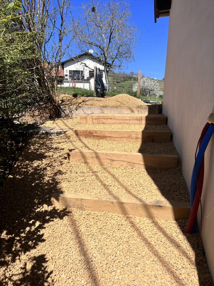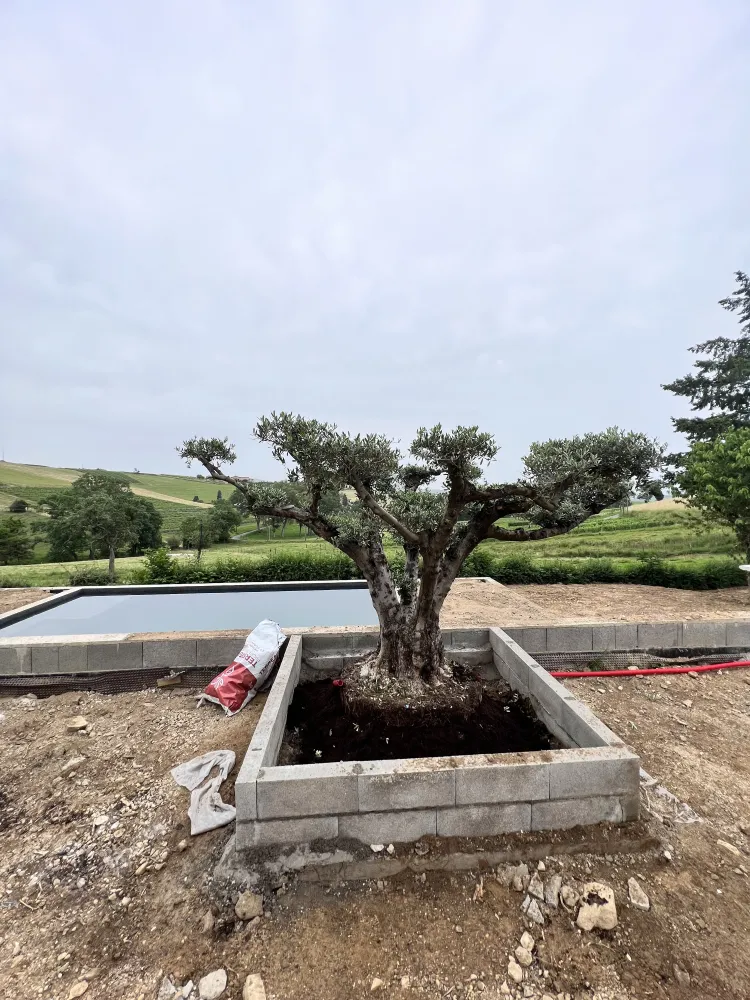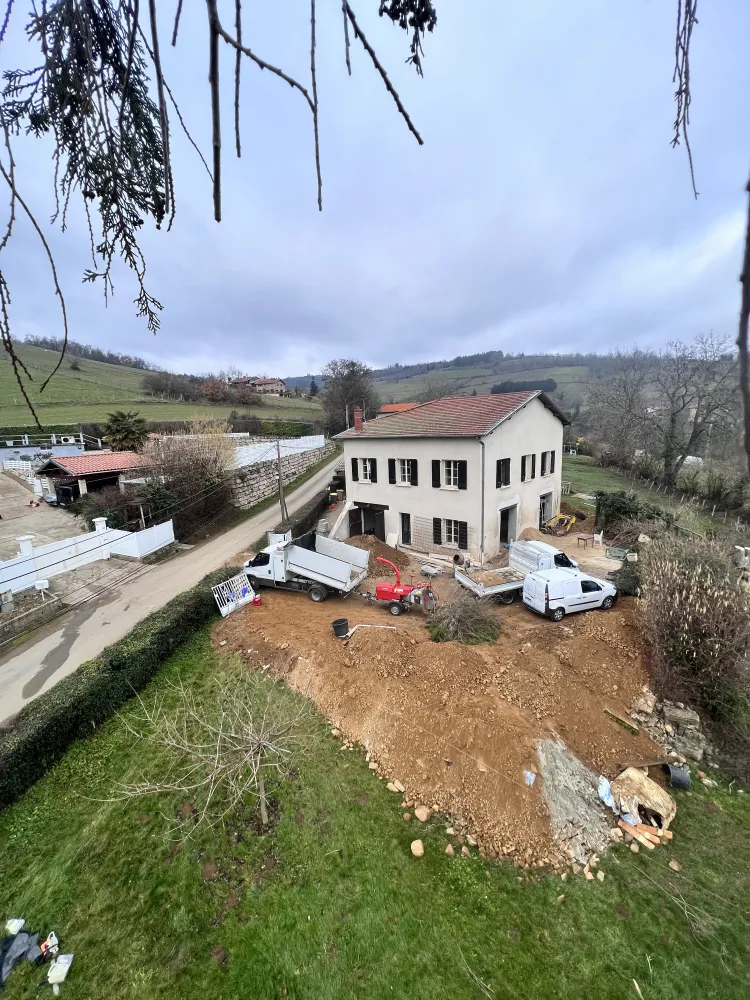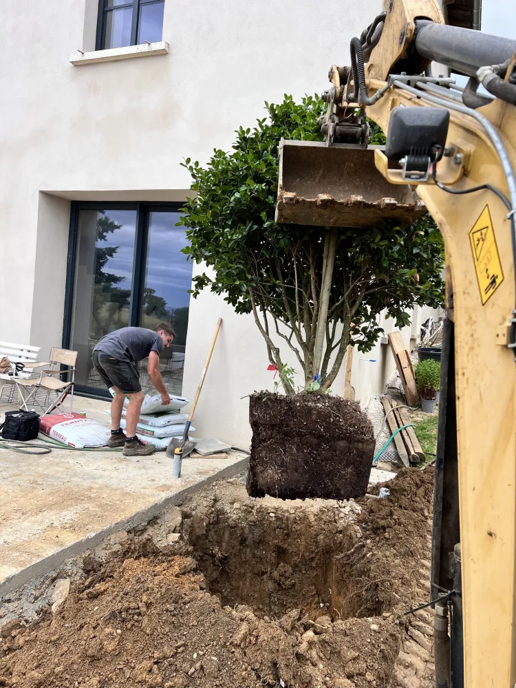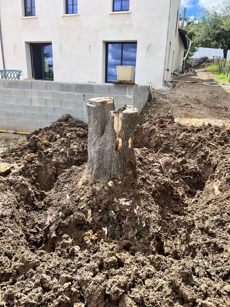 Le projet a débuté par un abattage d’arbre devenu nécessaire pour sécuriser la zone et libérer l’espace. Cette intervention a permis une meilleure exposition à la lumière et une préparation optimale du terrain en vue des futurs aménagements paysagers.
